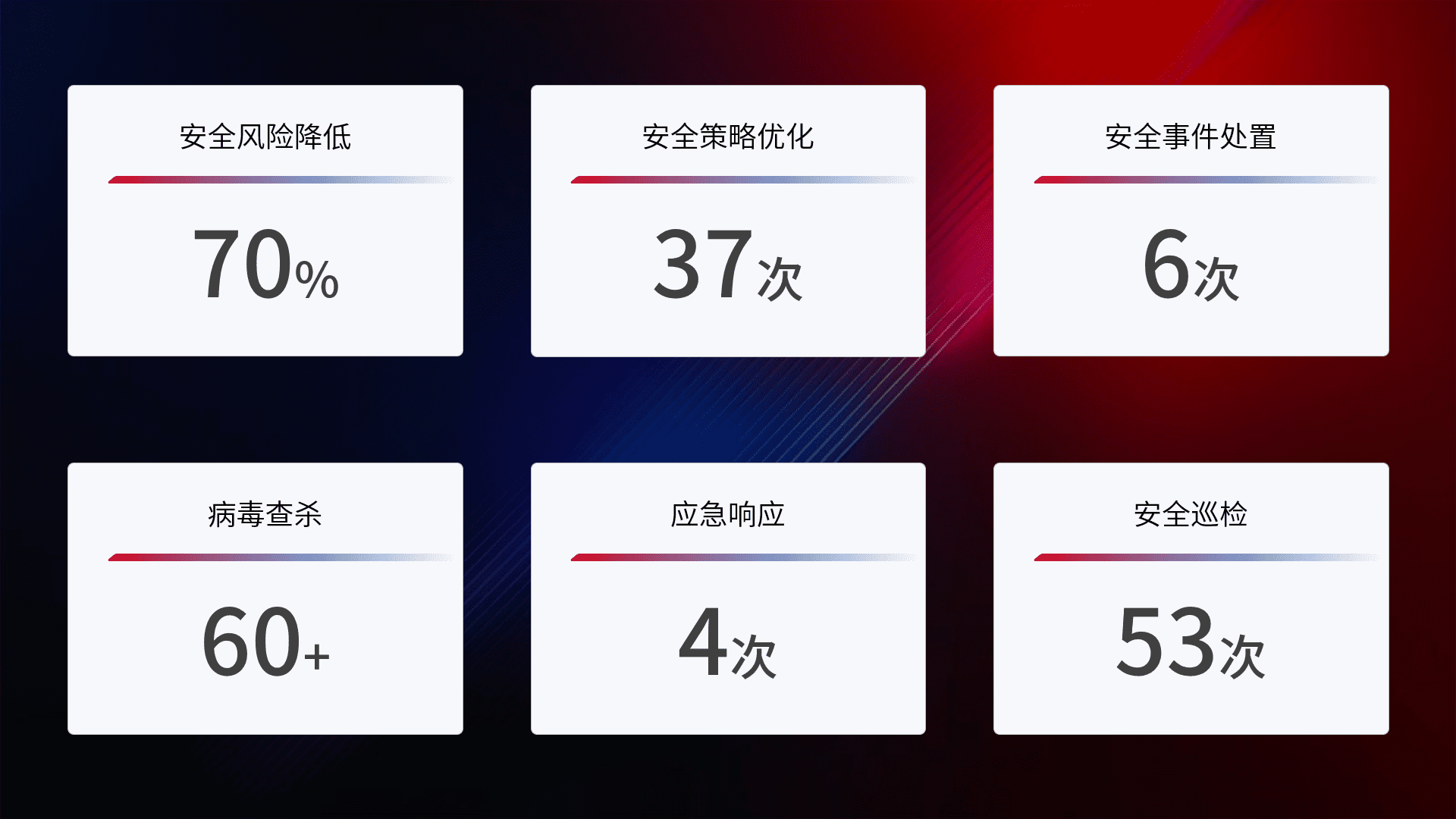 提供全面的安全事件报告体系,,,包括处置报告、、、、周报、、季度和年度总结,,结合持续监控,,,帮助客户深入了解网络安全状况。。
